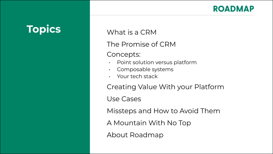 On June 15, 2022, Roadmap President, Steve Whittington, hosted a live webinar explaining why your business needs a CRM and the tactics for gathering the most useful customer data from it.